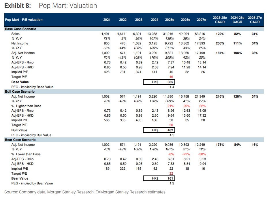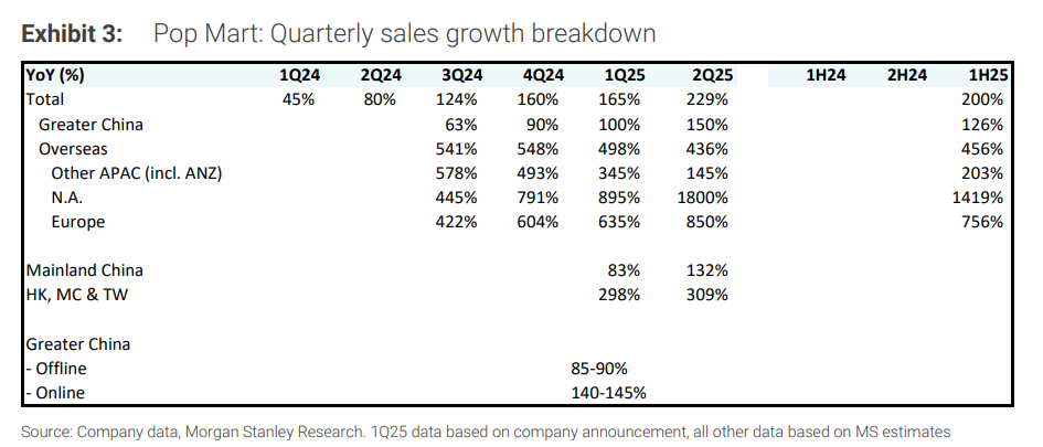 摩根士丹利认为,泡泡玛特上半年初步销售额和利润分别高出其预估8%和20%,大中华区和亚太地区是超预期的关键市场。大摩将目标价从302港元上调至365港元。虽然预期短期内可能面临获利了结压力,但认为调整后将为长期投资者提供良机,仍具"引人注目的上涨空间"。