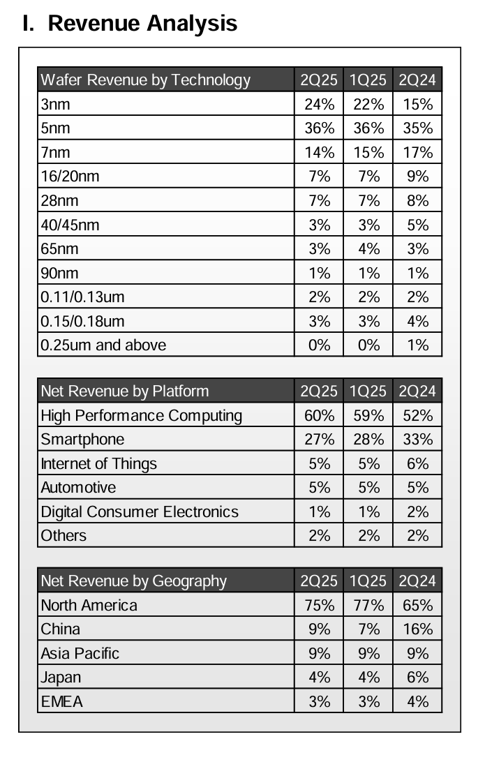 此外,HPC业务的强劲增长,营收占比达60%,环比增长14%。这主要受益于AI芯片需求的持续爆发。汽车业务环比增长30%。智能手机业务的相对疲软值得关注。虽然环比增长7%,但营收占比从去年同期的33%降至27%,反映了传统消费电子市场的持续低迷。