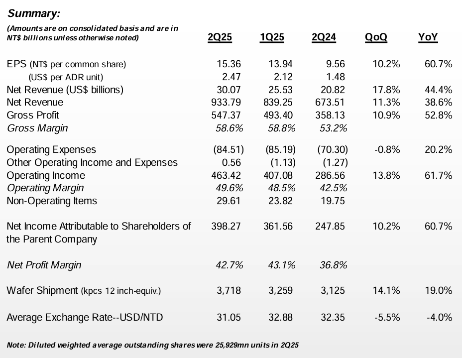 台积电二季度营收表现超出市场预期,同比增长38.6%达到新台币9337.9亿元,环比增长11.3%。以美元计价的营收增幅更为显著,同比增长44.4%至300.7亿美元,环比增长17.8%。增长主要由3nm制程的持续爬坡和HPC需求的爆发性增长驱动。